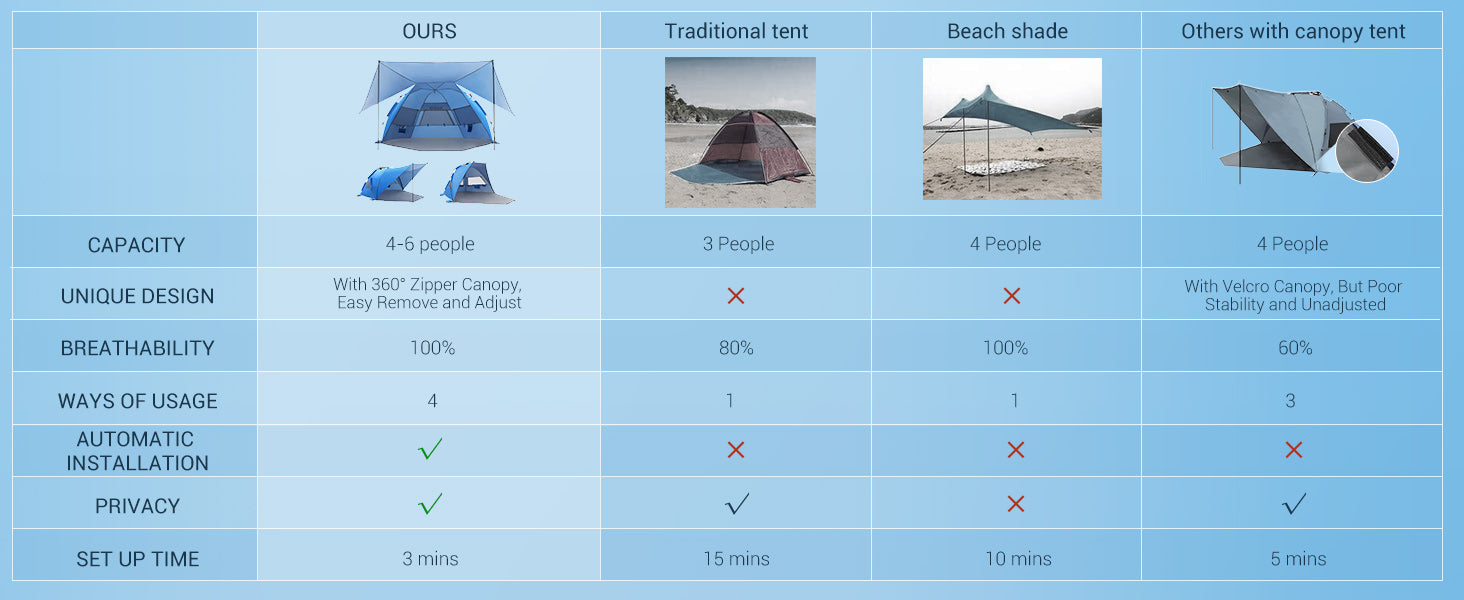 Made from 190T double-layer silver-coated polyester, this beach tent provides UPF 50+ sun protection and a cooling effect, lowering the interior temperature by up to 9℉ for added comfort.