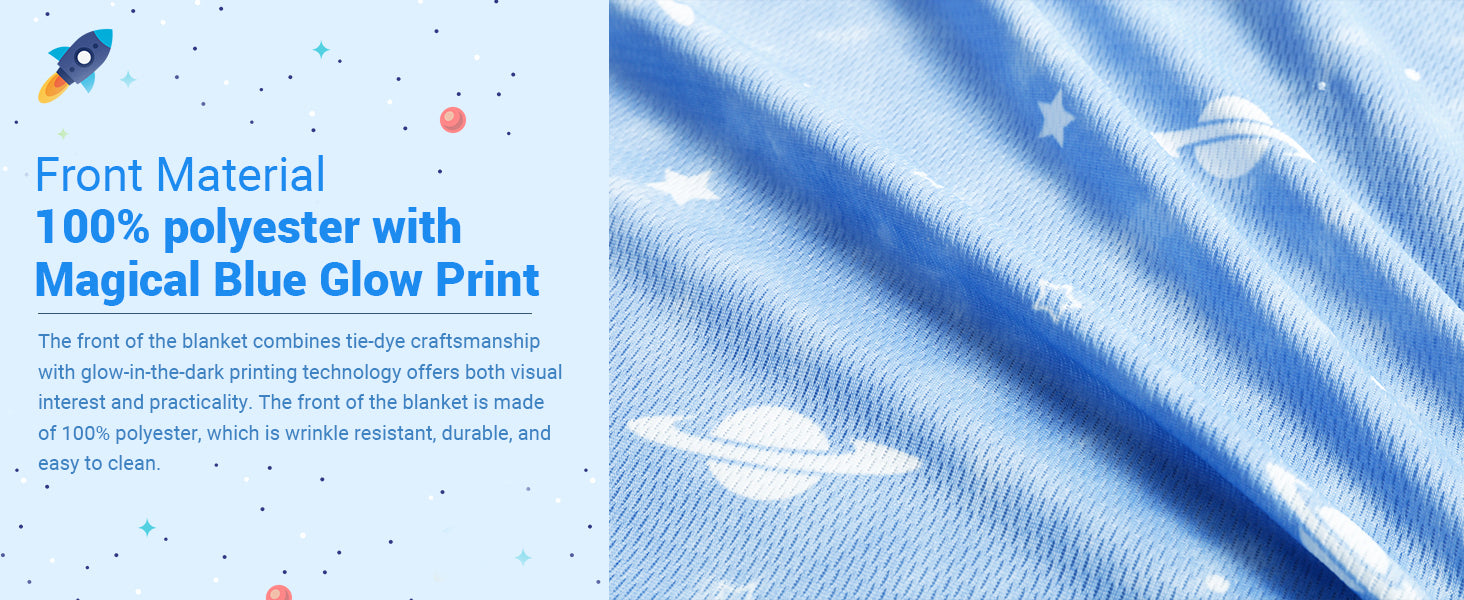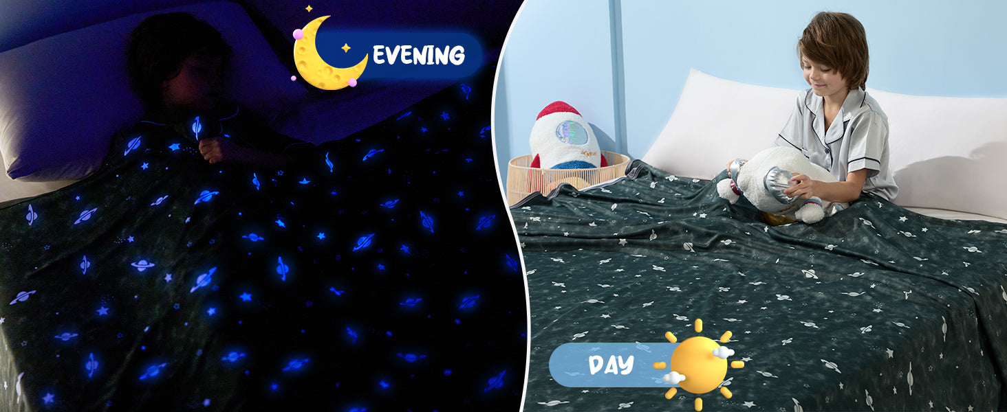 - 【How to Glow】Expose the printed side of the glow cooling blanket for kids to sunlight or bright light for 15 minutes.In a dark environment, you can see the beautiful pattern emitting a blue light on the blanket.
