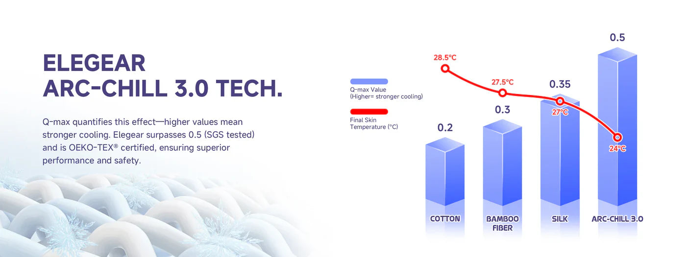 Instant Cooling Comfort: Arc-Chill 3.0 fabric (Q-Max >0.5) absorbs heat fast, lowering skin temperature by 4-9℉ for a sweat-free sleep.