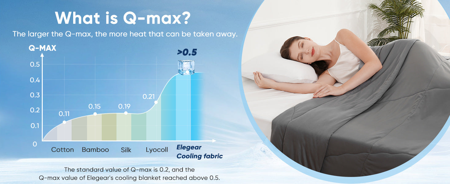 Elegear कूलिंग कंबल जापानी Q-Max 0.5 Arc-Chill कूलिंग फाइबर का उपयोग करता है जो शरीर की गर्मी को शानदार तरीके से अवशोषित करता है, जिससे त्वचा का तापमान तुरंत 2 से 5°C तक कम हो जाता है। यह आपको पूरी रात बिना पसीना बहाए ठंडा रखता है।