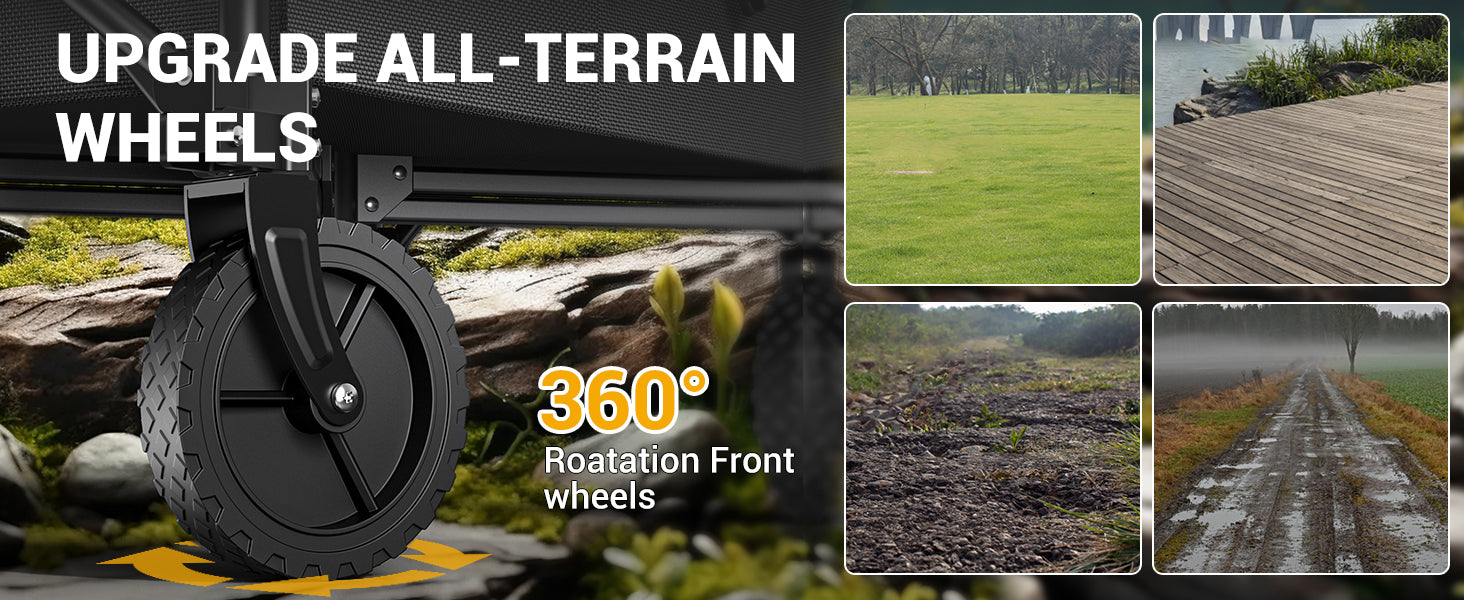 - Wheel Wonder - Conquering Every Terrain: Our wagon cart heavy duty foldable features 360° swivel wheels, making it suitable for various terrains, such as paved roads, dirt roads, and grassland etc. With 6.89-inch PVC wheels that resist deformation, enhanced with bearings for flexibility and durability, effortlessly pulling it is a breeze. Plus, the detachable four wheels add extra convenience.