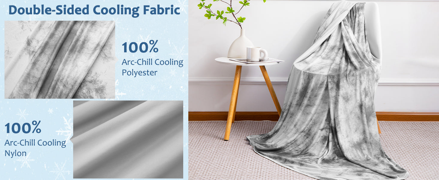 Made from 100% Arc-Chill cooling polyester on one side and cooling nylon on the other, this blanket delivers instant coolness from both sides. Engineered with Japanese Arc-Chill technology and infused with jade nanoparticles, it absorbs body heat, accelerates moisture evaporation, and lowers skin temperature by 4–9℉ for long-lasting freshness.