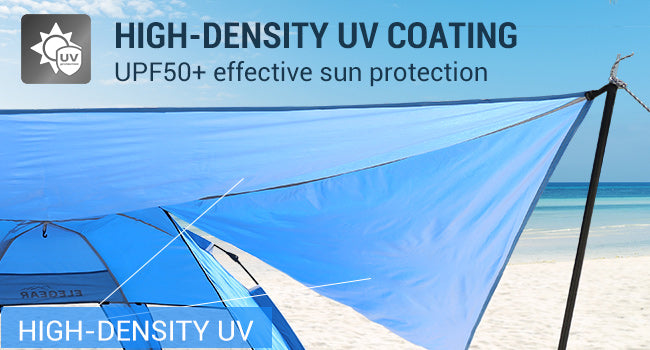 Made from 190T double-layer silver-coated polyester, this beach tent provides UPF 50+ sun protection and a cooling effect, lowering the interior temperature by up to 9℉ for added comfort.