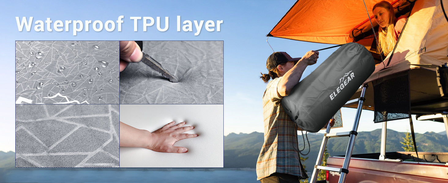 - 🏖️ Durable Camping Material& No Noisy — Enjoy sleeping in quiet comfort with the Elegear Insulated Sleeping Pad. Made from durable 50D elastic knit fabric, it offers breathability, moisture-wicking, thermal insulation, and tear resistance. Our inflatable camping pad is covered in thick waterproof TUP material, preventing punctures, moisture, and air leaks. Experience truly luxurious sleep, even in the harshest environments!