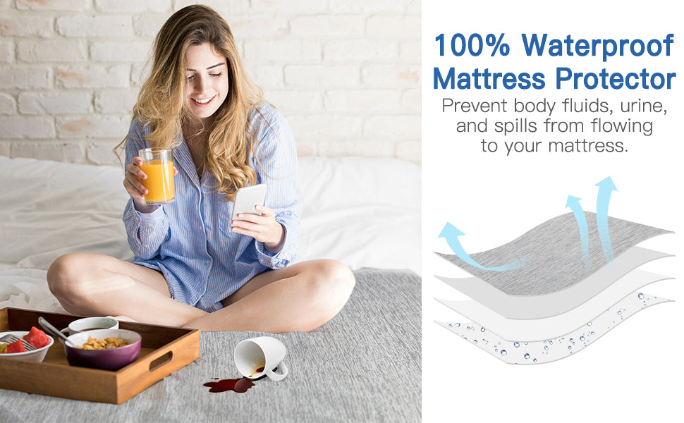 usa tecidos compostos de TPU à prova d'água de alta resistência recentemente atualizados, que podem proteger de forma mais abrangente o seu protetor de colchão contra poeira, derramamentos, suor e xixi de bebé, bloqueando efetivamente a humidade, prolongando a vida útil.